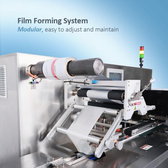 Haute automatisation : la machine utilise cinq servomoteurs, répartis sur les stations d'alimentation, de transport, de déroulement du film, de scellage intermédiaire et de découpe.