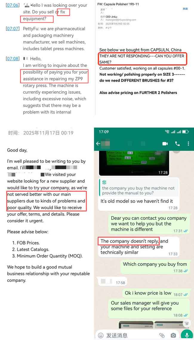 One of the most unexpected developments in recent years is the growing number of inquiries Rich Packing receives from factories that did not purchase our machines. These manufacturers own equipment from other suppliers—sometimes capsule fillers, sometimes automatic counting lines, sometimes powder fillers—but their reason for contacting us is always the same: they cannot reach their original supplier or cannot get issues resolved promptly.